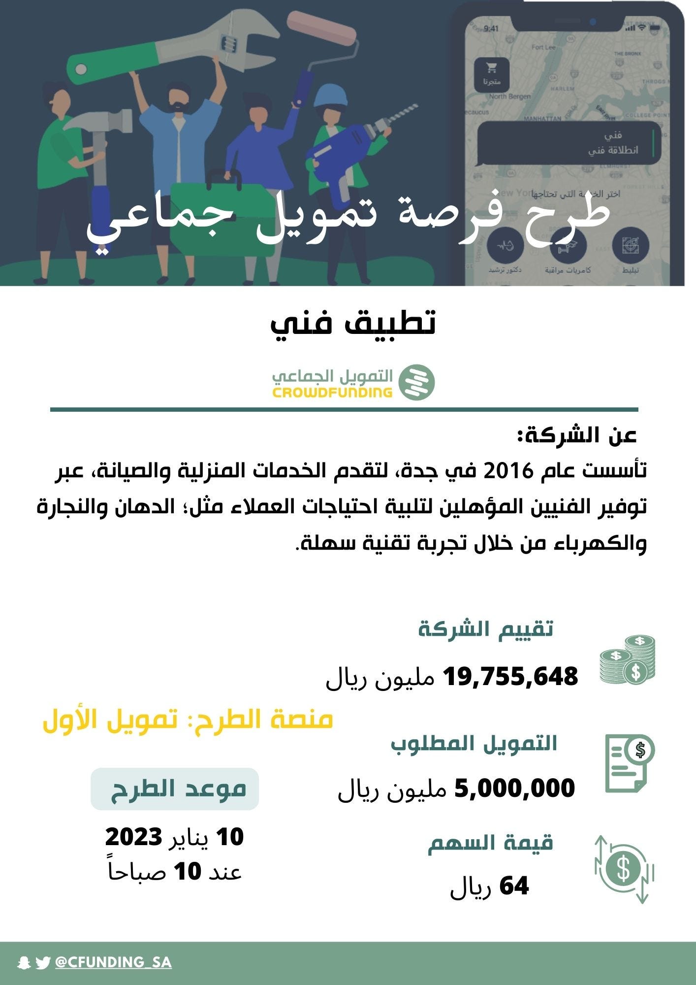 أحدث الشركات المطروحة على منصة تمويل الأول تطبيق فني، الذي يقدم خدمات متنوعة للصيانة المنزلية, للمزيد عن الشركة، وللاستثمار يرجى زيارة الرابط: FanniApp