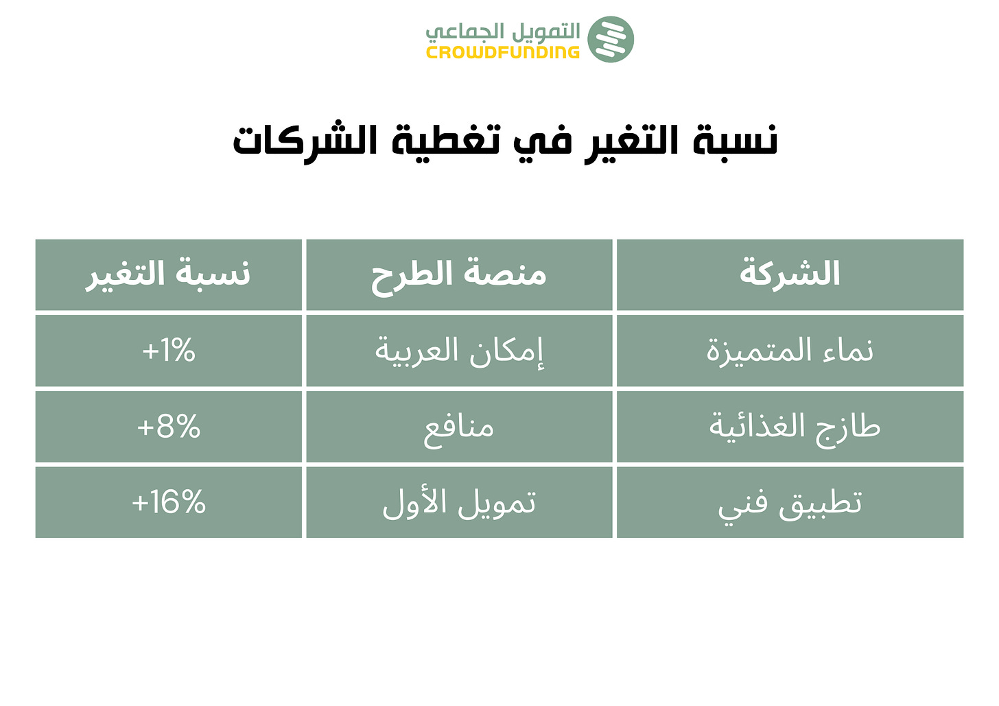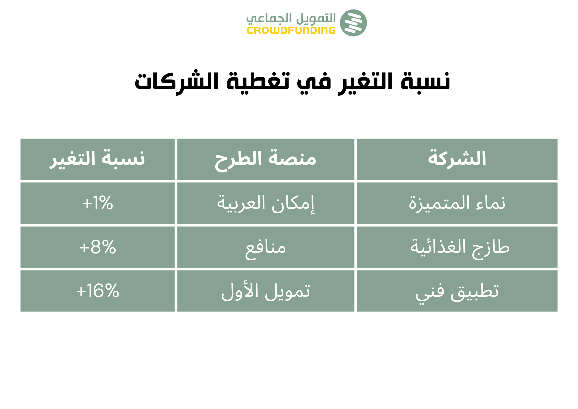 اكتمال تمويل شركتين عبر التمويل الجماعي بالملكية, فيما ألغي طرحين و تبقت 3 شركات لازالت متاحة للاستثمار